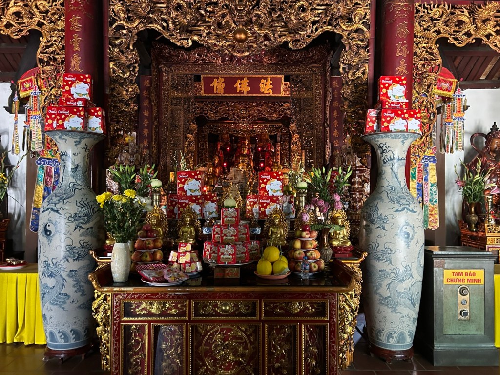 Inside, I was amazed that beside the ornate idolatry, were pyramids of fresh fruit, and piles of branded biscuit tins. It felt very out of place for somewhere so sacred.
