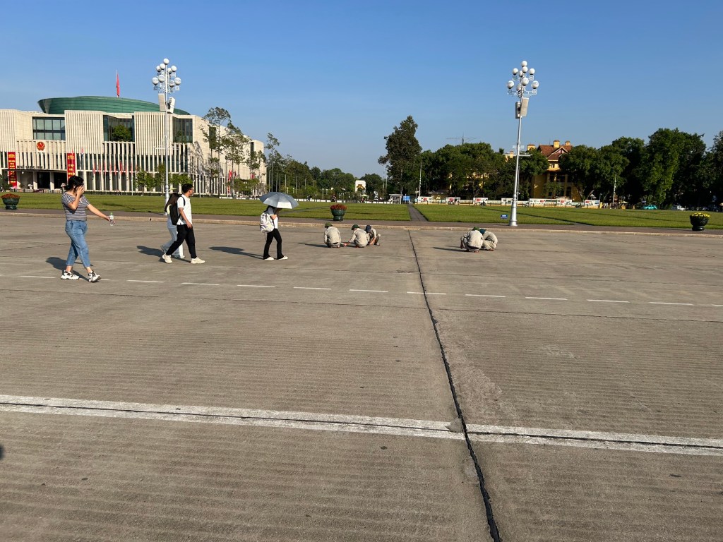 I noticed there was a man weeding the grass (wearing his pointy hat) and several more people blowtorching the concrete concourse in front of the mausoleum. They looked like they weren’t there by choice (serving some form of community service). I asked Ly if this was the case, and she said no, they were probably undercover secret police.