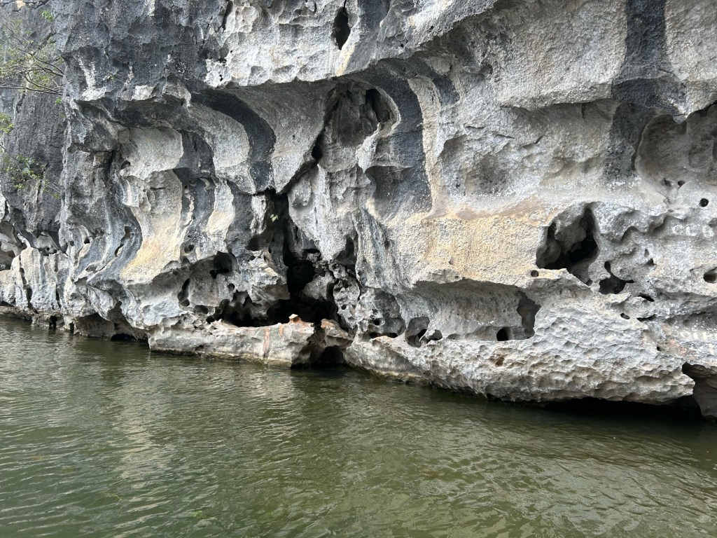 As the boat progressed further down the river, one of these rocky lumps drew nearer in front of us. It was actually a cave, and the the rock looked like it was hovering a metre or two over the water surface.