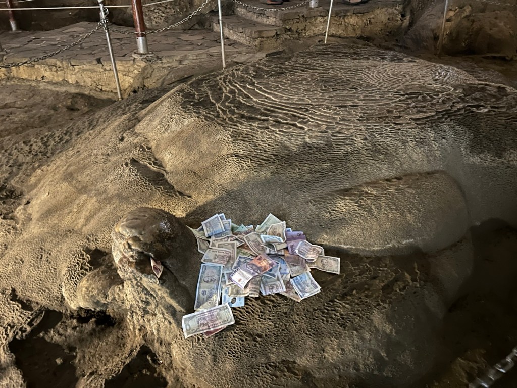 This one looks like a turtle, and because this is a sacred animal in Vietnamese culture, people come here and leave money.