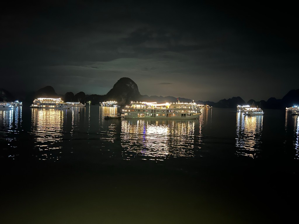 After dinner we headed onto the top deck to soak up the scenery at night. You could just make out the sky behind the mountains when dark. The flotilla of boats moored at sea now illuminated with fairy lights, and an echo of awful karaoke carrying through the bay.