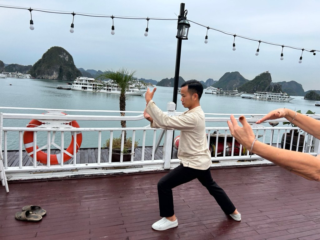 Still aboard the Hera cruise somewhere in Ha Long Bay, we have a Tai Chi class on the top deck of the boat at 6am. Tai Chi is a Chinese martial art which is very popular in south east Asia. Tour guide Dan has done this every morning for 8 years to stretch muscles, clear the mind and start the day with fresh purpose.