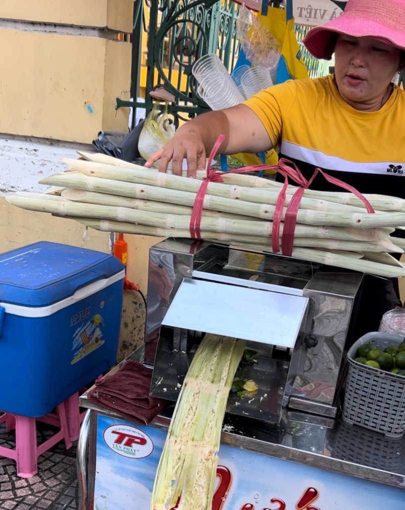 Eventually we come to a stall selling sugarcane juice. The sugarcane looks like bamboo shoots, and a machine presses them, squeezing juice into a plastic cup.