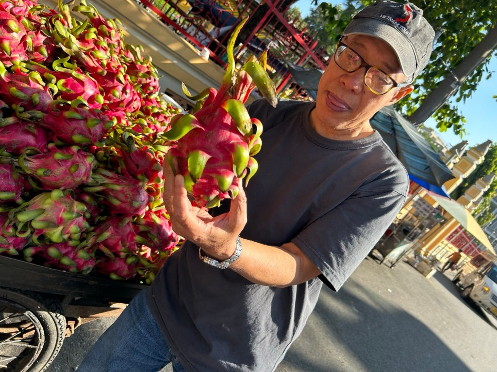 The bus takes to a market stall at the side of a busy road. Here a number of weathered street sellers, man stalls selling fish, fruit and crickets. I bought a dragon fruit for the banter, but no idea how or when I’m going to eat it.