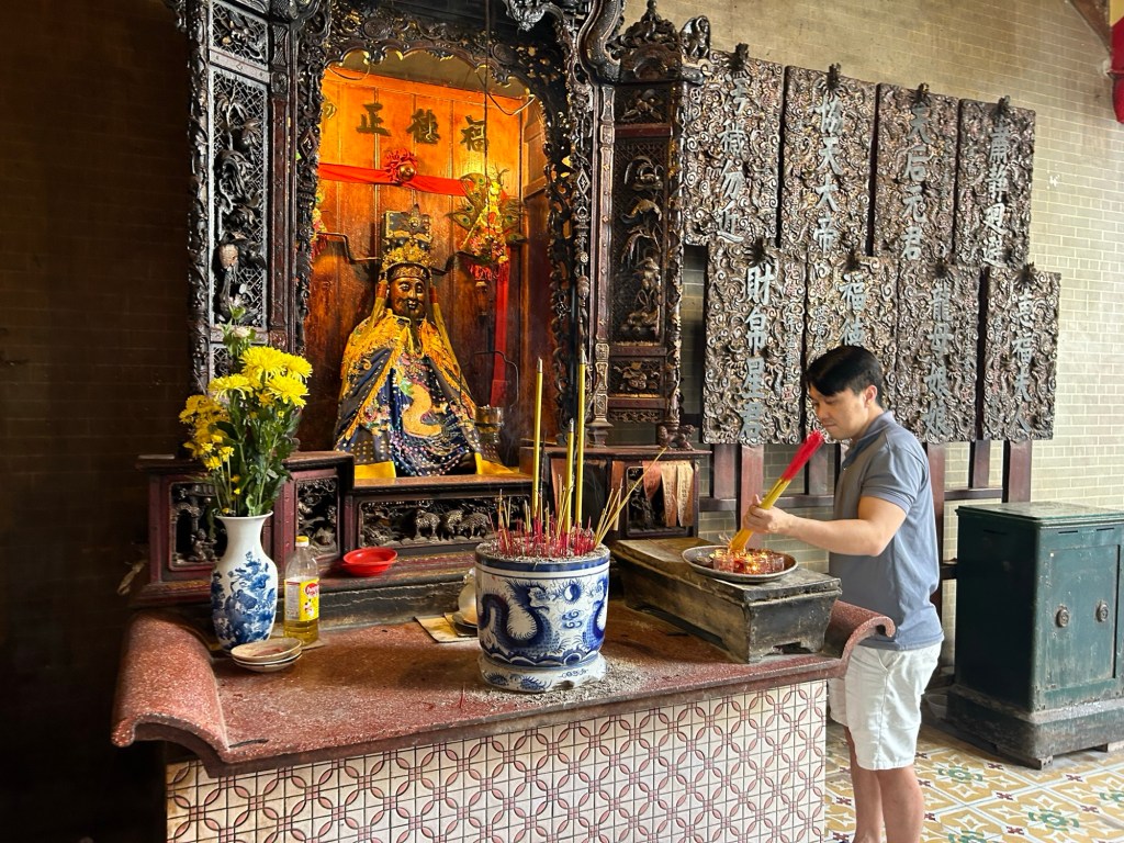 It’s shoes off at the door before we can enter. Just like being back at home! Inside is incredibly ornate, and decked out in red and gold. The colours signifying power and luck per Chinese culture.