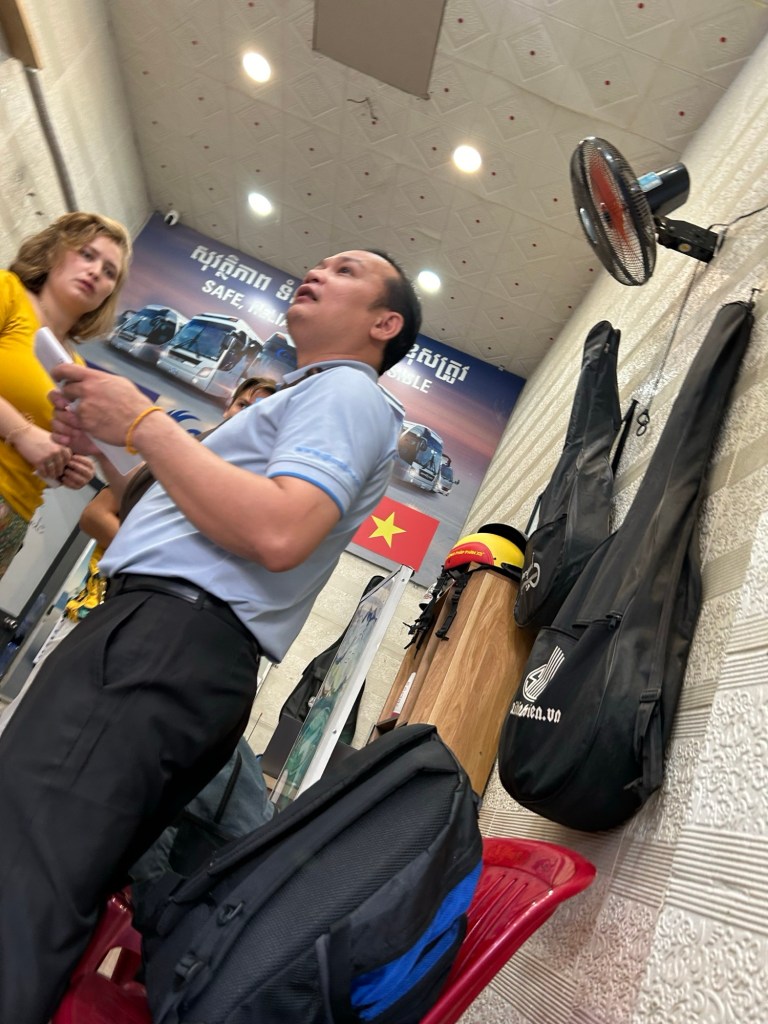 We’re travelling on the Giant Ibis bus – a journey scheduled to take 8 hours or so (including a few stops). A man with a bumbag round his chest is running around getting passengers to fill in cards to accompany the visa (Much more on him later.