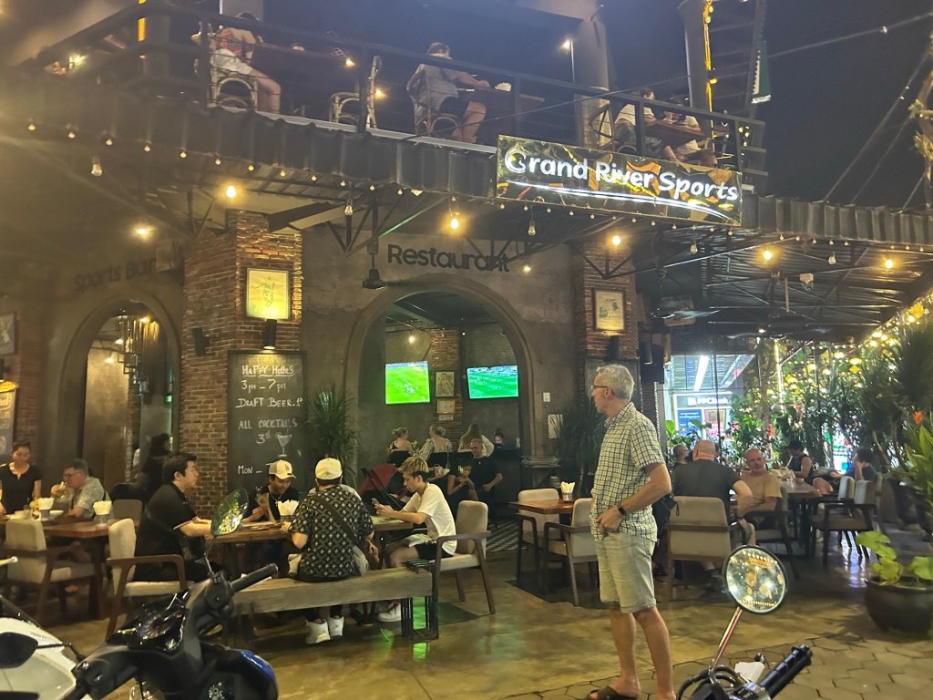 After about half an hour, the fireworks stop, and the crowd slowly disperses. Yet to eat, we look for a restaurant, but in the general busyness, go with the first one we see – Grand River Sports bar.