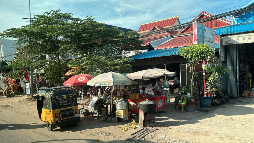 As we drive through the city towards the bus stop, Lesley tells us that today is a national holiday in Cambodia. Really? It looks like there are a few stages half built, and there are a lot of flags up, but maybe this is normal?