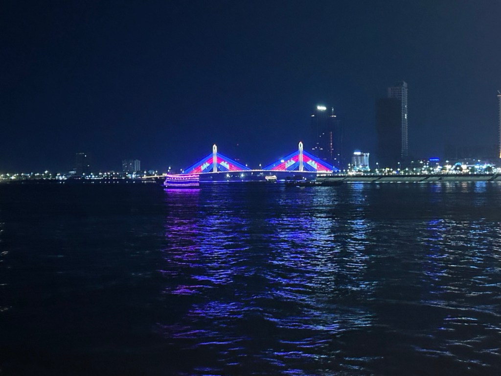 From the water, Koh Norea (Korean friendship) bridge sticks out in the distance. Here, the colours of the Cambodian flag project onto the side of the bridge, and it generally looks pretty cool.