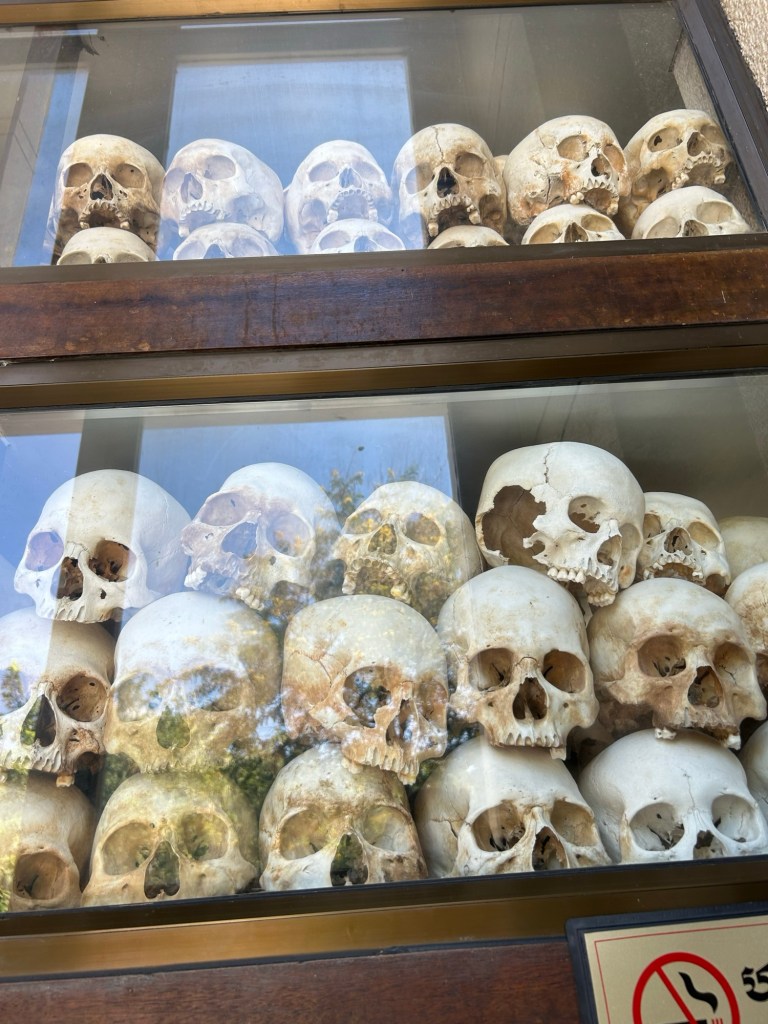 Inside the stupa, visitors are asked to take off shoes before entering. There are hundreds of skulls stacked on shelves as far up as the eye can see. All of these have been exhumed from the burial pits.