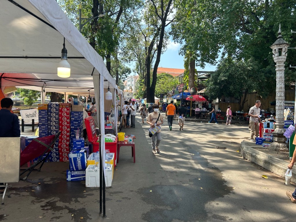 Due to the busyness – the footpath has been taken over by the food stalls, and a new section of footpath is fenced off from the traffic laden main road. This is about three lanes wide, and in one direction, with a one way system in place. Crossing is easier than Vietnam as drivers will typically be prepared to stop to let you by.