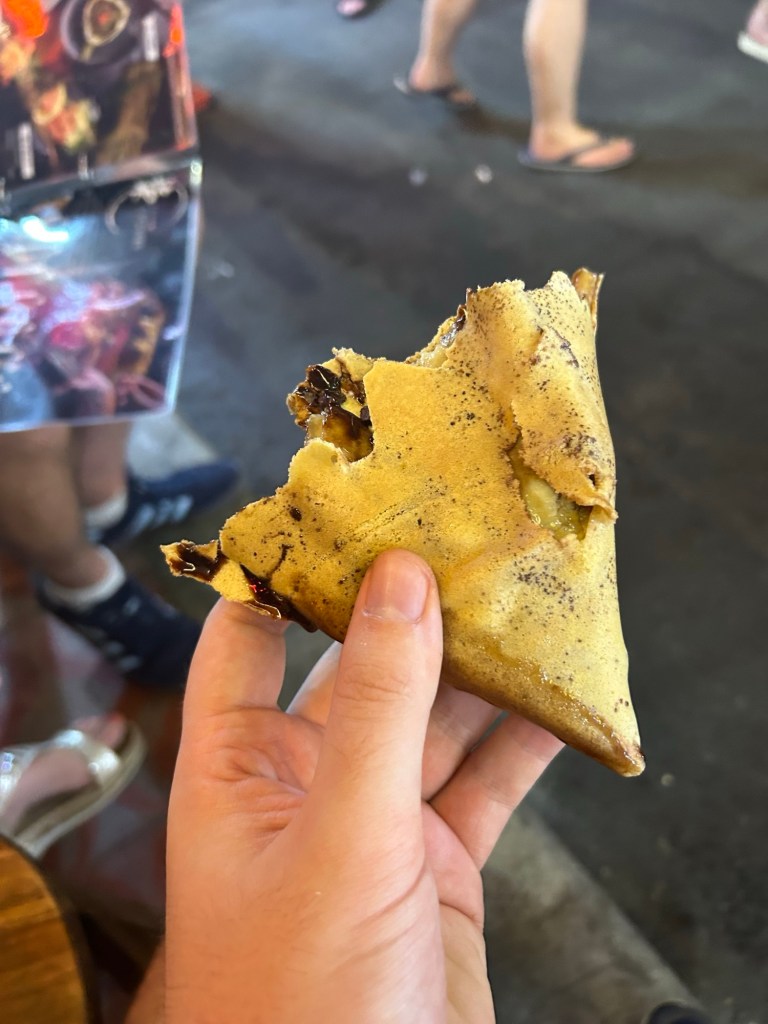 Elsewhere on the side of the road, we come across a nice looking crepe stall. I fancy something sweet, so opt for a banana, chocolate and whipped cream filling. Again, people are constantly filing past, and there’s still no space to eat. I’m now stood standing, holding my sticky melting chocolate crepe, sweating buckets with smell of vomit coming out of my backpack; meanwhle pressed toe to tail against people on every corner. I am not enjoying this one bit. (The experience, not the crepe. That was fantastic!)