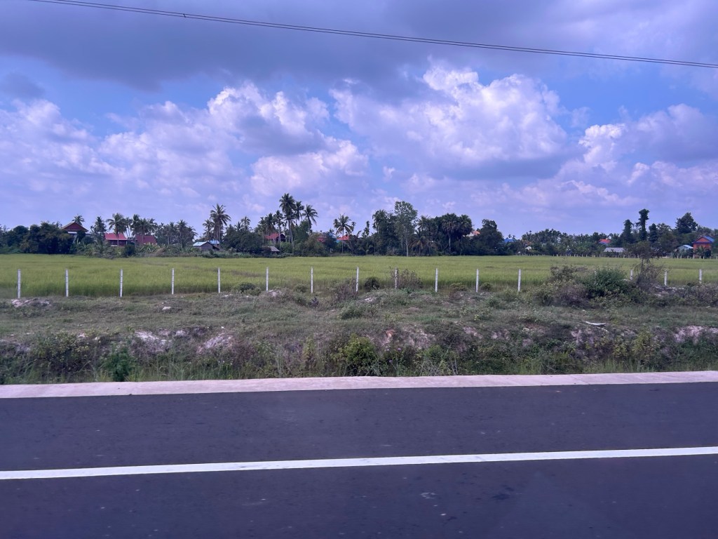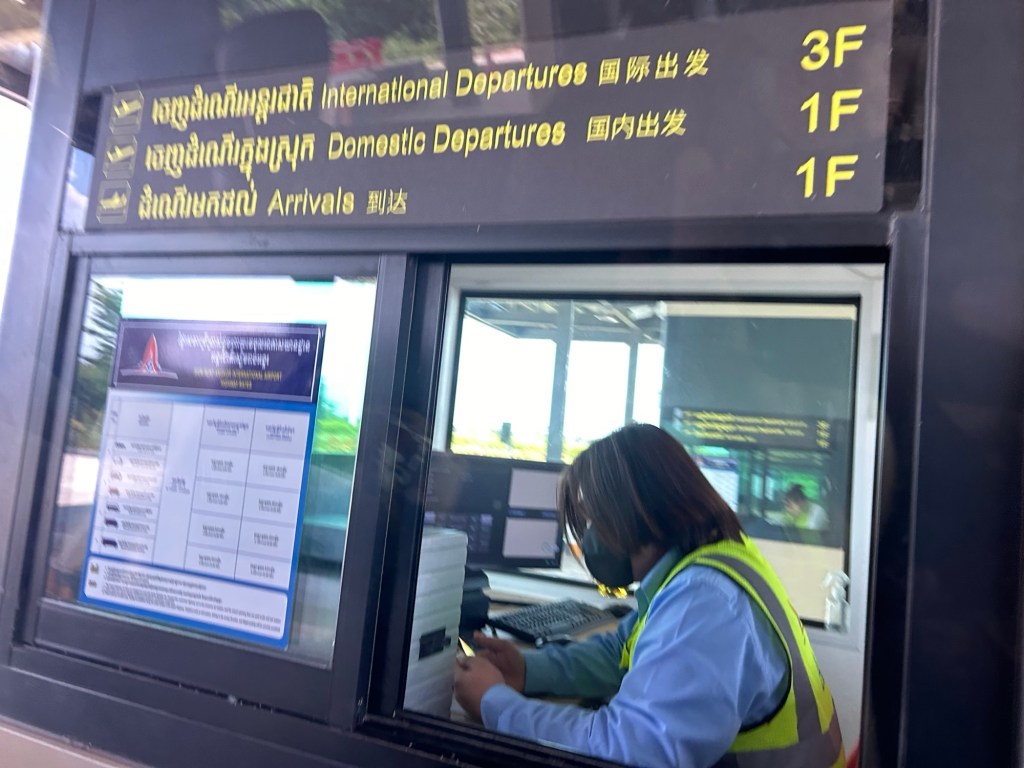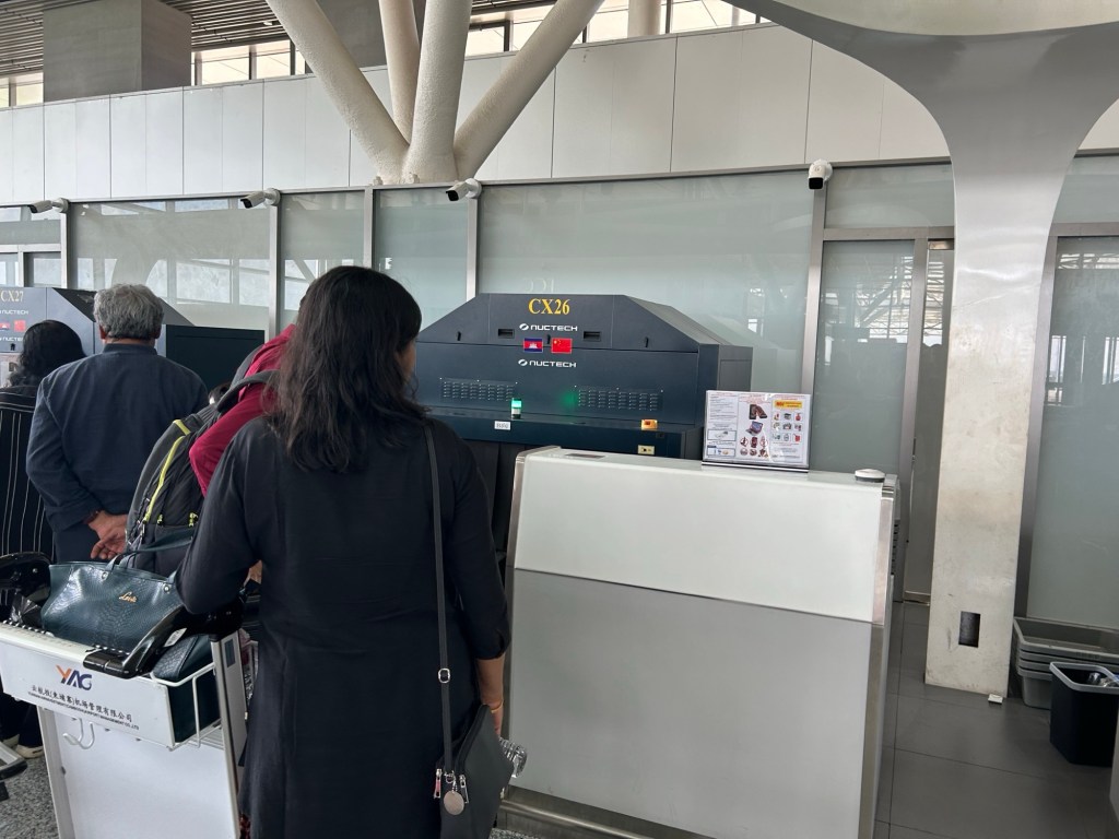 Approaching Siem Reap Angkor International Airport, we drive through a toll plaza with signs including Chinese translations, and TVs showing Chinese state TV. Inside the airport itself, Chinese flag stickers bedeck the suitcase scanning machines. Its pretty clear who’s funded all of this!