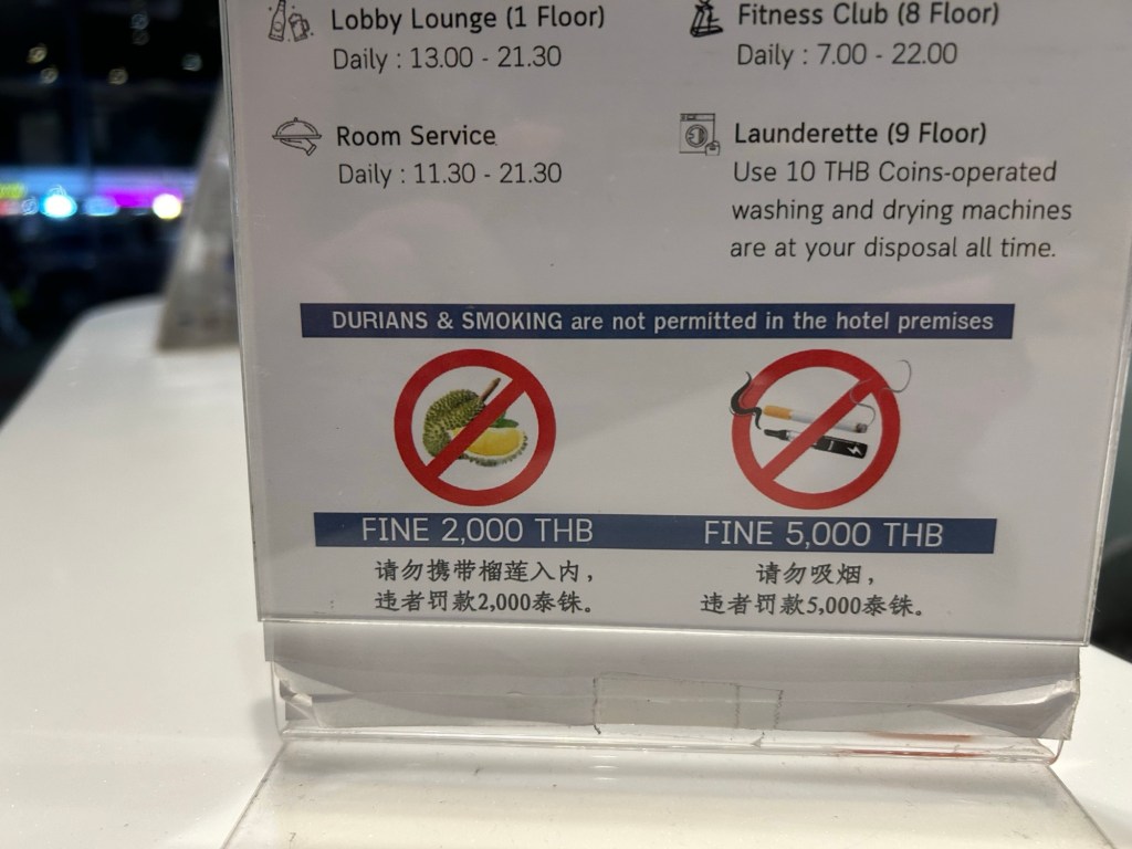 Inside the hotel, there’s a sign on the counter, saying that Durian is banned in the hotel, and carries a 2000 Baht fine (that’s roughly £50).