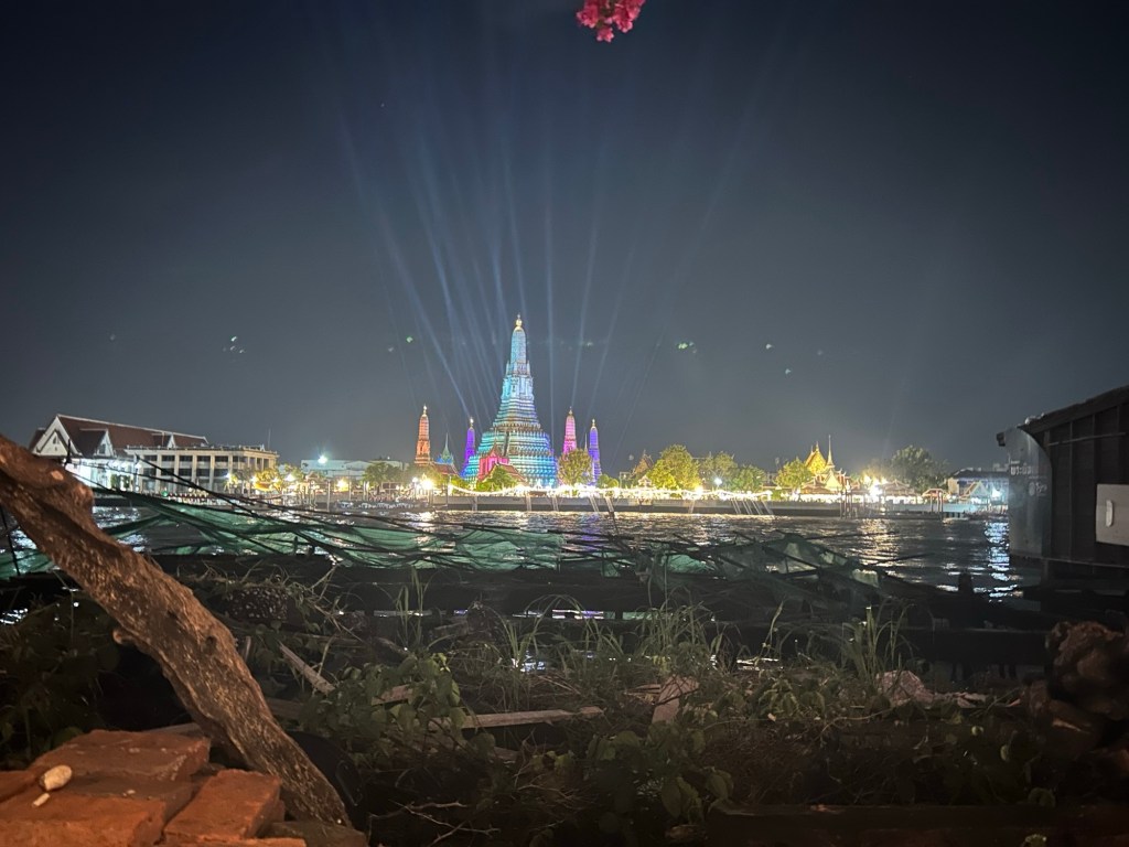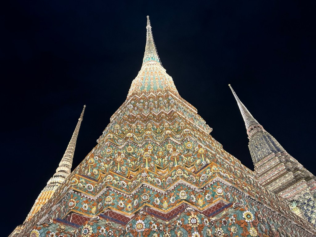 The temple is resplendent in colourful artificial lighting – no doubt due to the Loy Krathong festival happening this weekend. (This is the Thai festival of water and lights – very similar to the Bon om Tuk water festival in Cambodia at the same time). Aside from the colourful lights, there’s not much else going on. It looks like we’re in the wrong part of town for the big celebrations.