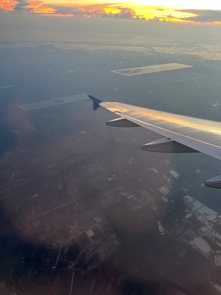 There’s a slight delay on the flight (about 1 hour), but aside from that, it’s another very smooth flight. I’m at the right side of the plane to see the Angkor temples through the window, but the in the sunsetty haze, the remaining light only glistens off the water.