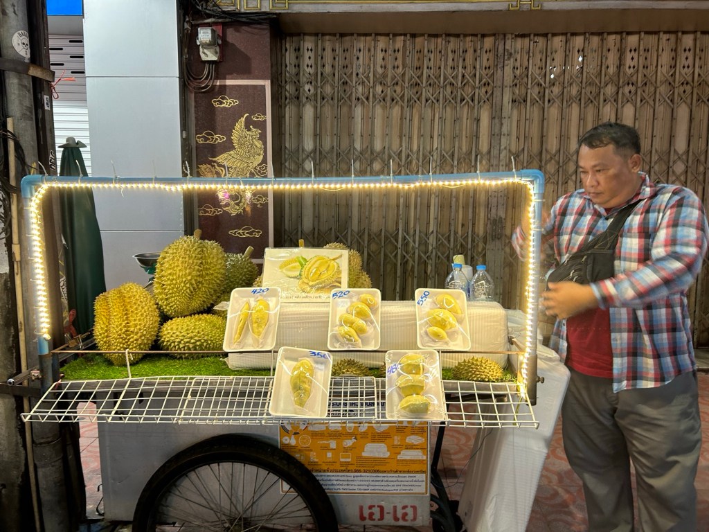 I come across another durian stall, and buy the smallest piece I can, but there’s not really anywhere to sit and eat it with any privacy, so I stick it in my backpack for later.