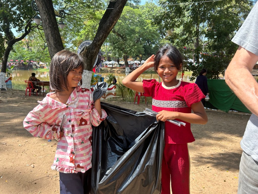 Two other young girls walk up to us with a black bin bag to collect our bottles.