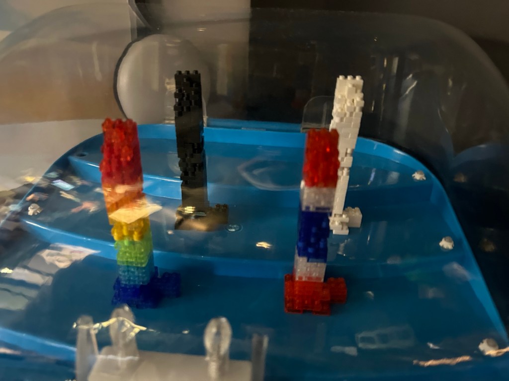 The gift shop is one floor down from the top, and it’s pretty sweet! A postcard vending machine, games, ornaments and Lego! (Well not Lego, you know, but same idea!) It comes in four colour options, all black, all white, the Thai colours (red, white and blue), and rainbow colours. I was hoping for all black, and wasn’t fussed with the rainbow version. Trust my luck on the lucky dip!