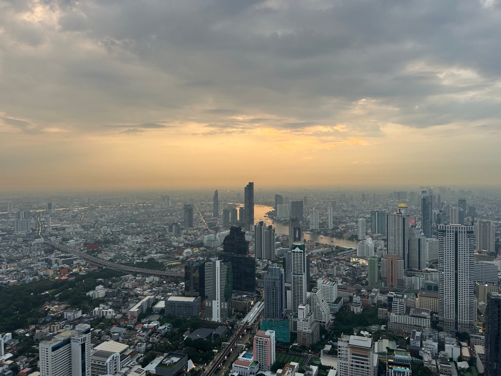 Bangkok looks its best from the sky at sunset. The golden hues reflecting from the sky over the Chao Phraya River are just beautiful.
