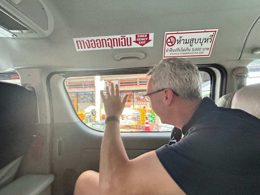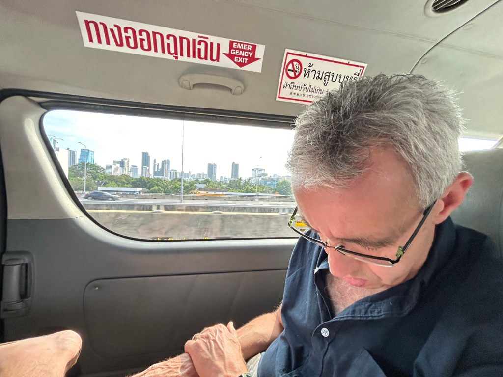 The Taxi came to pick us up at 3pm and away we went headed once more for the airport. Like every other pickup, everything was prompt and on time to the second. Dad waved to the 7-Eleven as we left…