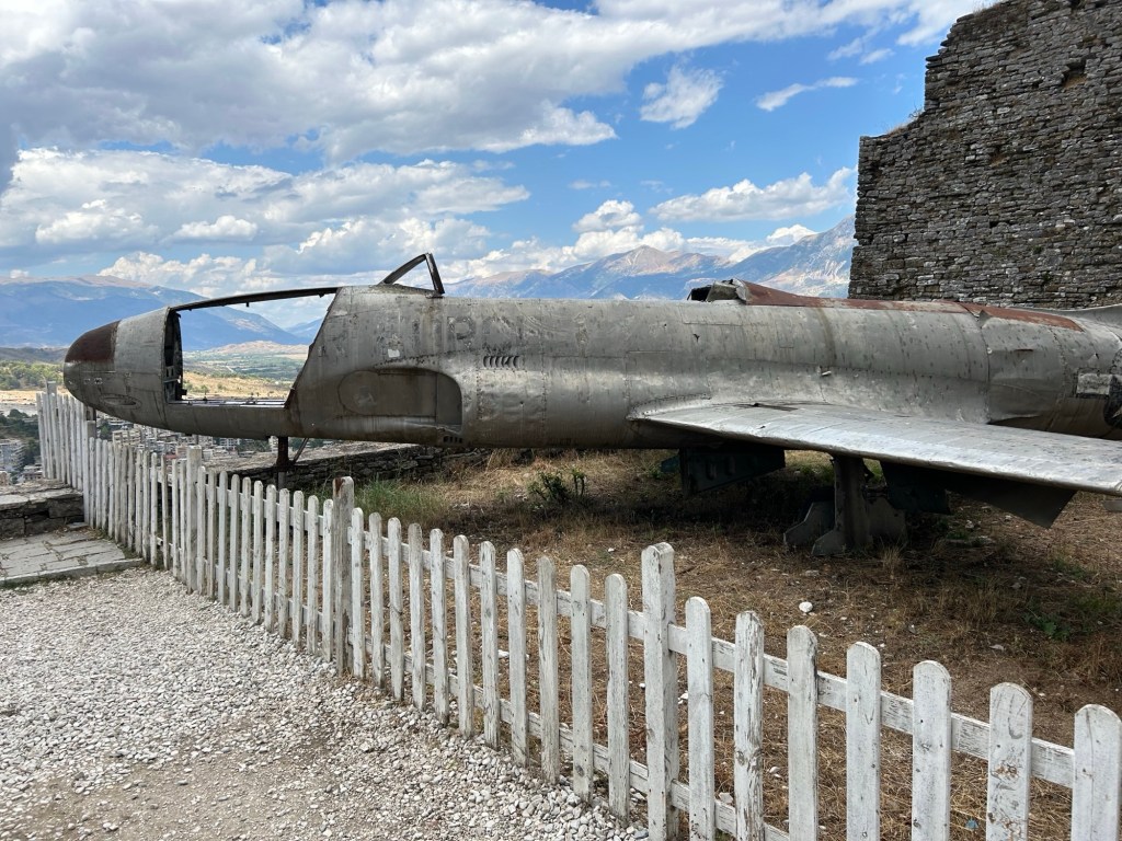 On the way to the clock tower, we spot the remains of an American T-33 military plane from the late 1950s. This was during the period of paranoia by the communist government. The damaged plane was forced to land in Tirana airport after suffering mechanical issues. The American story is that they were flying from France to a military base in Naples, Italy and got lost in thick fog then ran out of full and had to make an emergency landing in Tirana. The Albanians say it was a spy plane and intercepted it, forcing it to land in Tirana. The pilot was imprisoned, and the remnants of the plane displayed as a trophy up on top of Gjirokastër castle. If they really did get lost, they were a heck of a distance away from Naples!