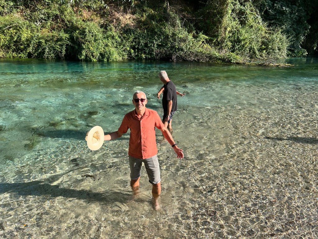 The water bubbles up from a deep underground cave (some 50m down) and the waters are icy all year round. You can’t swim in the main pool, but can get into the river further upstream. Indeed, the icy waters proved just a bit too icy for the old man. Needless to say, I faked some camera difficulties when photographing him in the water for full effect.
