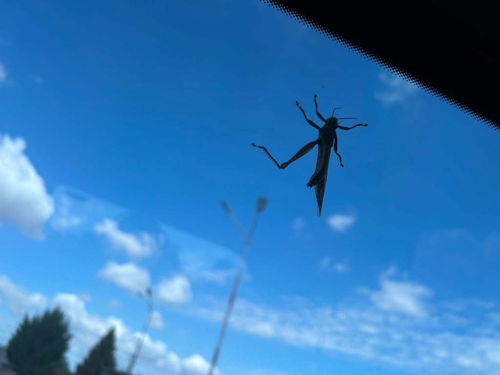 I nearly jump off my seat when I catch a ginormous bug on the window in the corner of my eye. It’s on the outside but clinging on valiantly for dear life.
