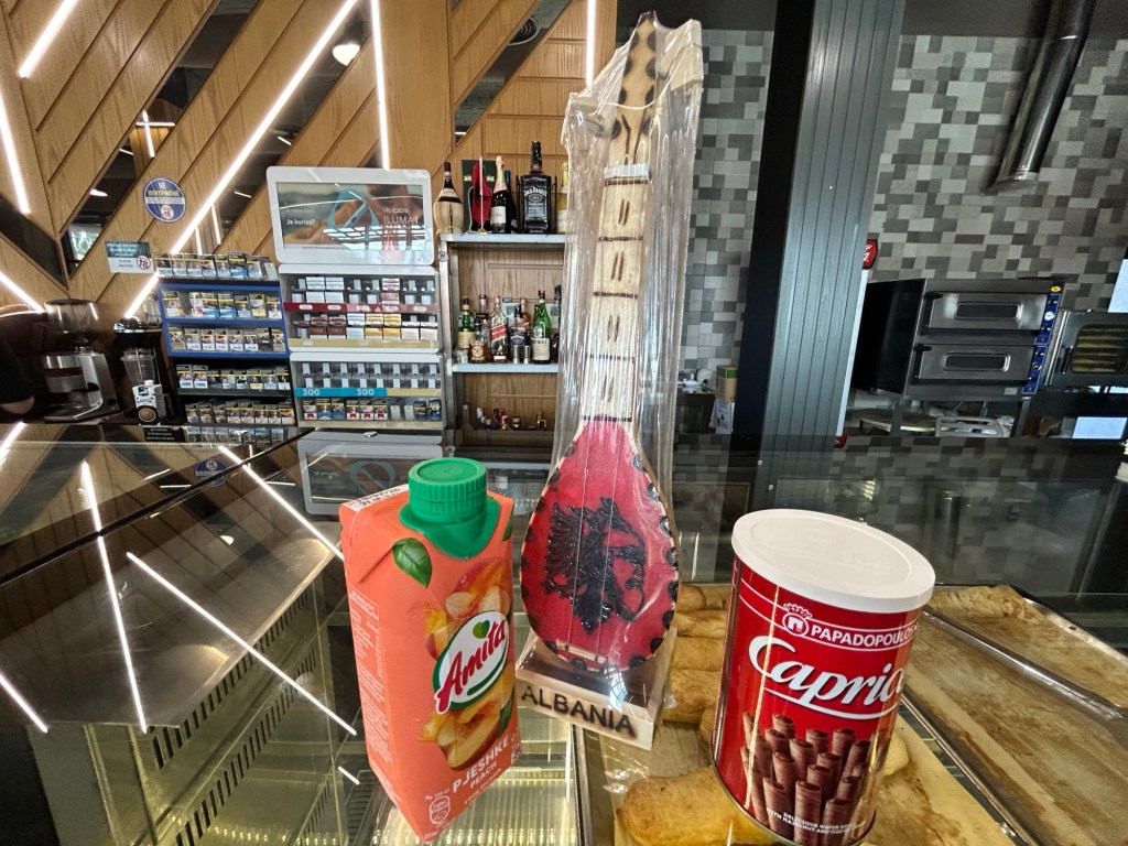 Speaking of coffee, the first stop was a comfort break almost an hour in, and while many took the opportunity to grab a coffee, I took the opportunity to buy more tat from the gift shop – a miniature traditional guitar with the flag emblazoned on its body. I also spotted some of the chocolate filled wafer rolls I remember from Greece. They’re so good!
