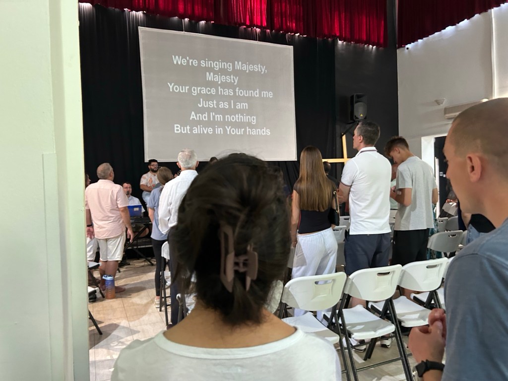 As we enter the church (IPA Tirana) we’re greeted by a gentleman on the door, and worship is already underway.