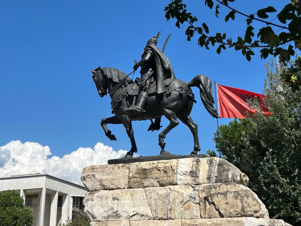Also in Skanderbeg Square is a large national flag. The Albanian flag has a red background, and black eagle on top. The eagle has two beads, one looking left and the other looking right. Why a double eagle? Well, as they say, two heads are better than one. The actual reason is that it was a symbol which featured on the heraldry of several noble Albanian families in the Middle Ages – not least the Kastrioti family which Skanderbeg belonged to.