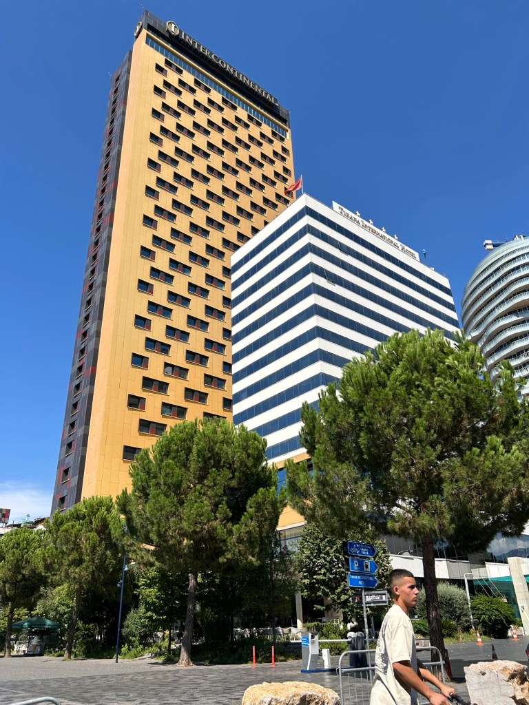 A number of tall buildings line the side of the square. These include, the Tirana international hotel which was built during communist times. It was the highest building in Albania at that time, but is now dwarfed by the Intercontinental Hotel directly behind it.