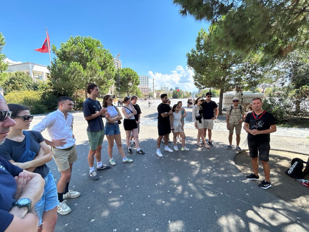 We walk as far as Skanderbeg Square, which is a large open plan piazza in the centre of the city. From here, we have booked to join a free walking tour at 2pm. We’re an hour early so take a few photos then head to a bar for some drinks to pass the remaining time.