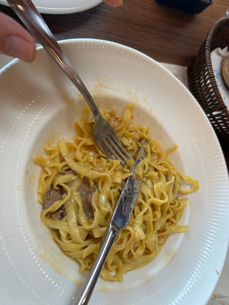 We make our way downstairs to a small bar area, then set sights on a restaurant for lunch. Fortunately there is one in a wooden chalet style building. I go for a traditional pasta dish – but it’s basically a fancier version of super noodles with slabs of beef – pretty much the same buttery taste and all! Let’s call them super duper noodles!