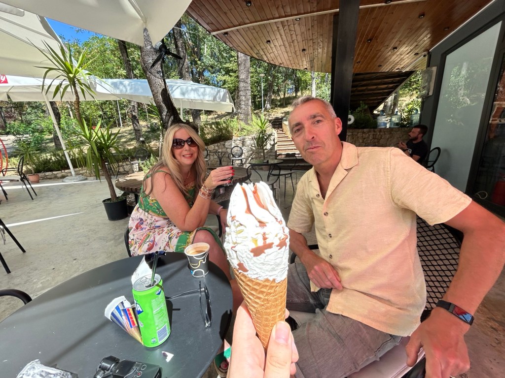 We follow a long winding path through the trees, and ready for a drink, we’re very happy to see the sight of sun parasols bearing the Aperol Spritz logo. Sadly no savoury food options until later in the day though, so it’s a Fanta Exotic and ice cream for me.