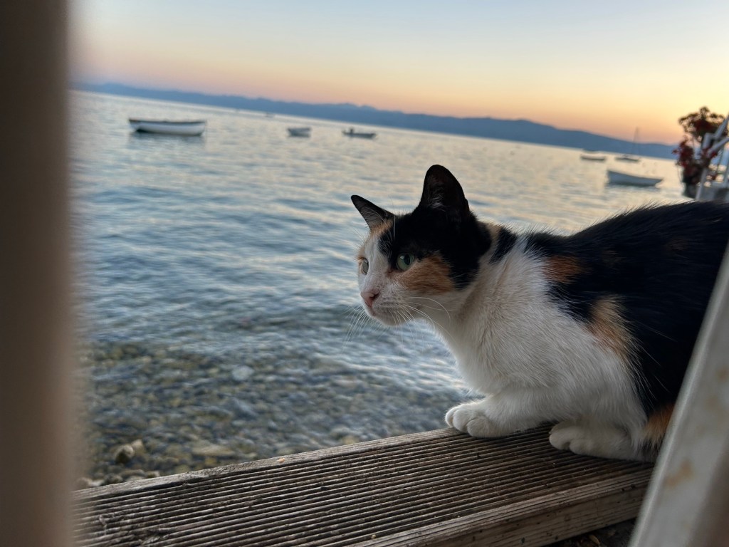 We enjoy the last throws of the sunset, while waiting (quite a long while) for the food to arrive. A 3 piece folk band play while we wait, and everyone is having a great time. 5 cats are prowling the wall beside, but despite giving me the eyes looking for good, are not happy with the slice of orange I’ve given them from my plate. Talking about biting the hand that feeds you!