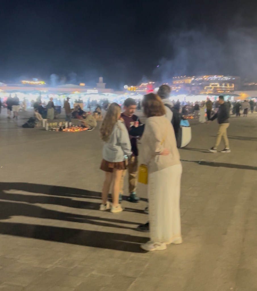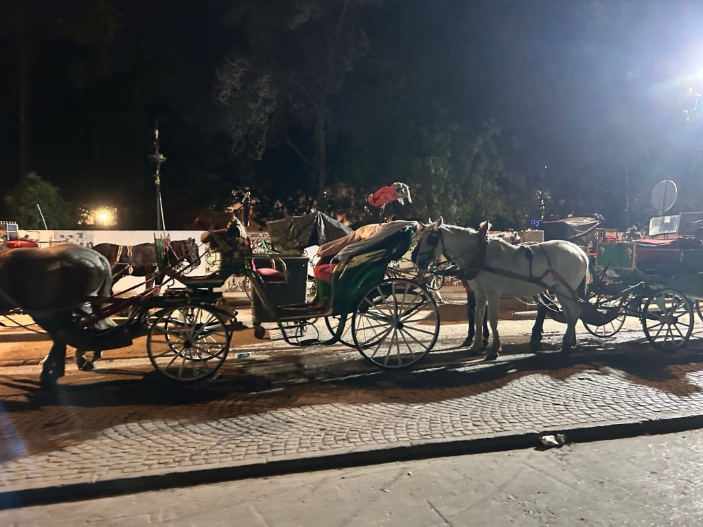 After dinner, we walked to the Jemaa el-Fnaa square, past a line of idle horse carriages (and through the inevitable pungent poo smell). We’ll save the square for tomorrow and walk on for now!