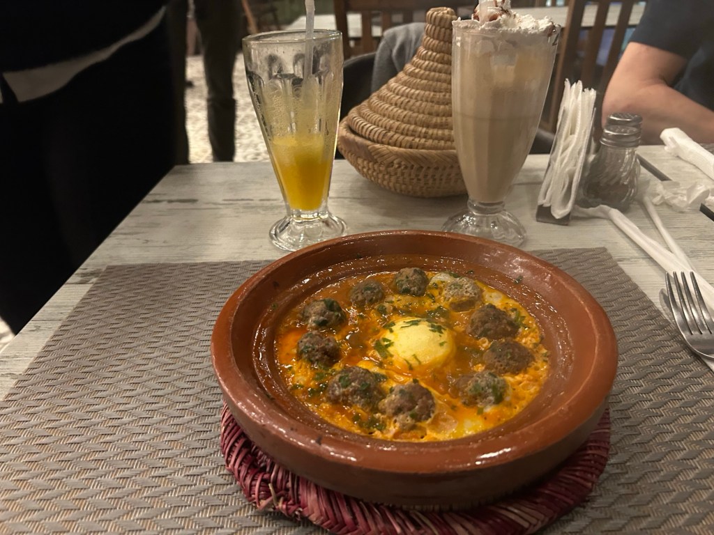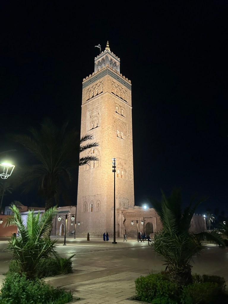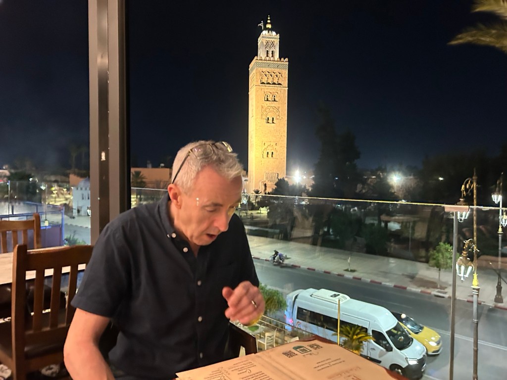 We’re not in the mood for messing around with dinner, so settle for the first restaurant we see – La Table de la Koutobia, with a rooftop table overlooking the famous Koutobia Tower. It’s a 77 meter tall minaret belonging to the largest mosque in the city. You could say it’s ’mosque see!’ 😂