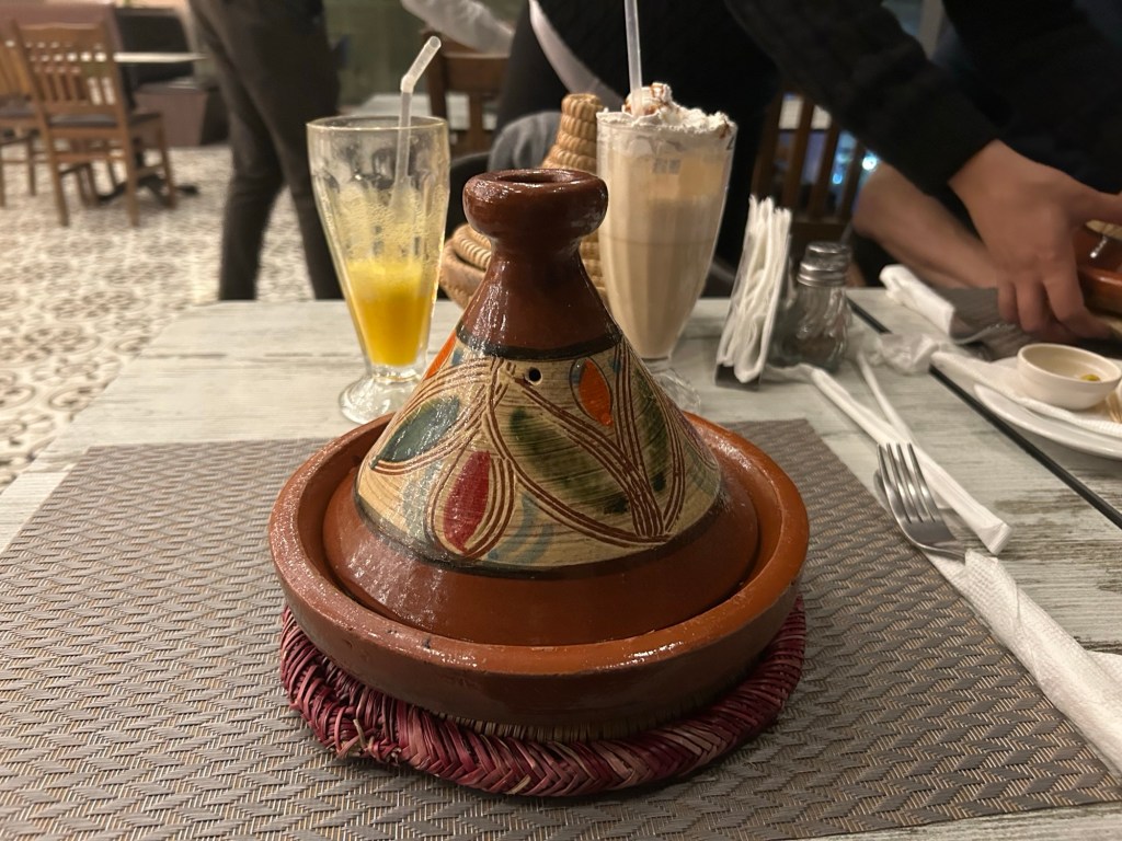 The restaurant menu was pretty Moroccan (with burgers and pizzas to cater for the less sophisticated tourists!) I opted for a tagine. It’s basically a stew dish cooked in a clay bowl with a groovy chimney shaped lid. The lid traps in all the steam, which condenses supposedly creating more tenderful and flavoursome meals. I concur, it tasted great!
